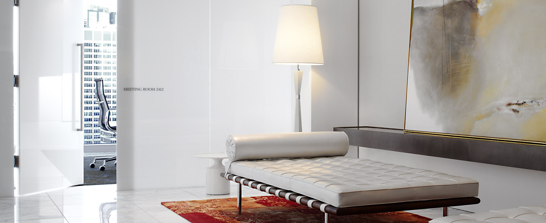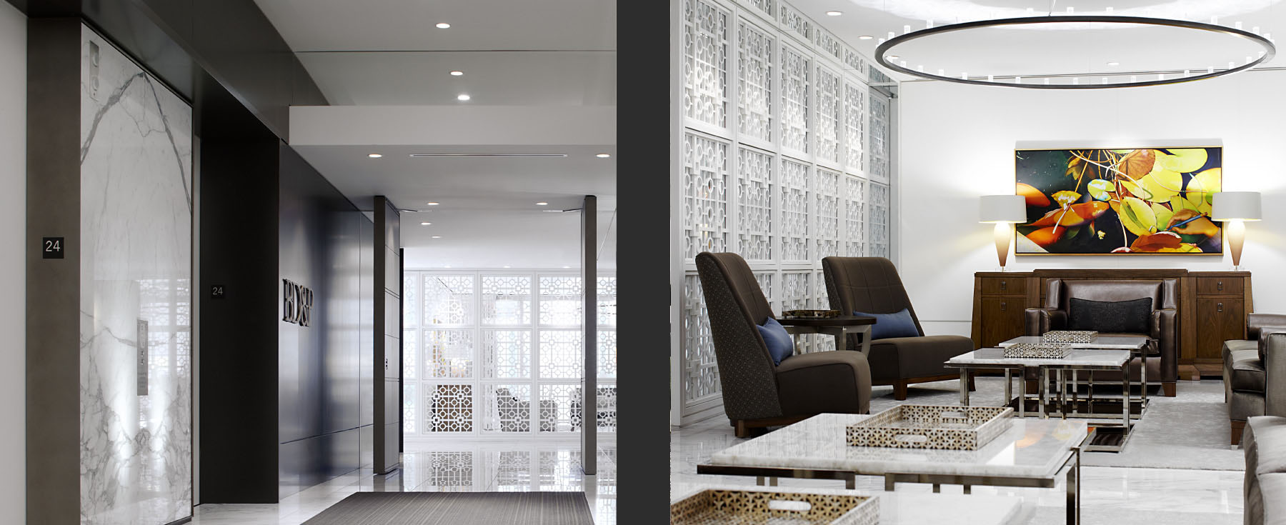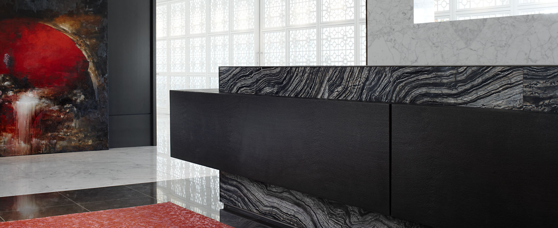 The simplified and refined finish palette utilizes highly contrasting materials such as white and charcoal lacquer trimmed in dark bronze set against white statuario veneto marble and black basalt flooring. This palette becomes a strong architectural backdrop for an extensive contemporary art collection. Lighting and furnishings incorporate traditionally inspired pieces with more contemporary designs.