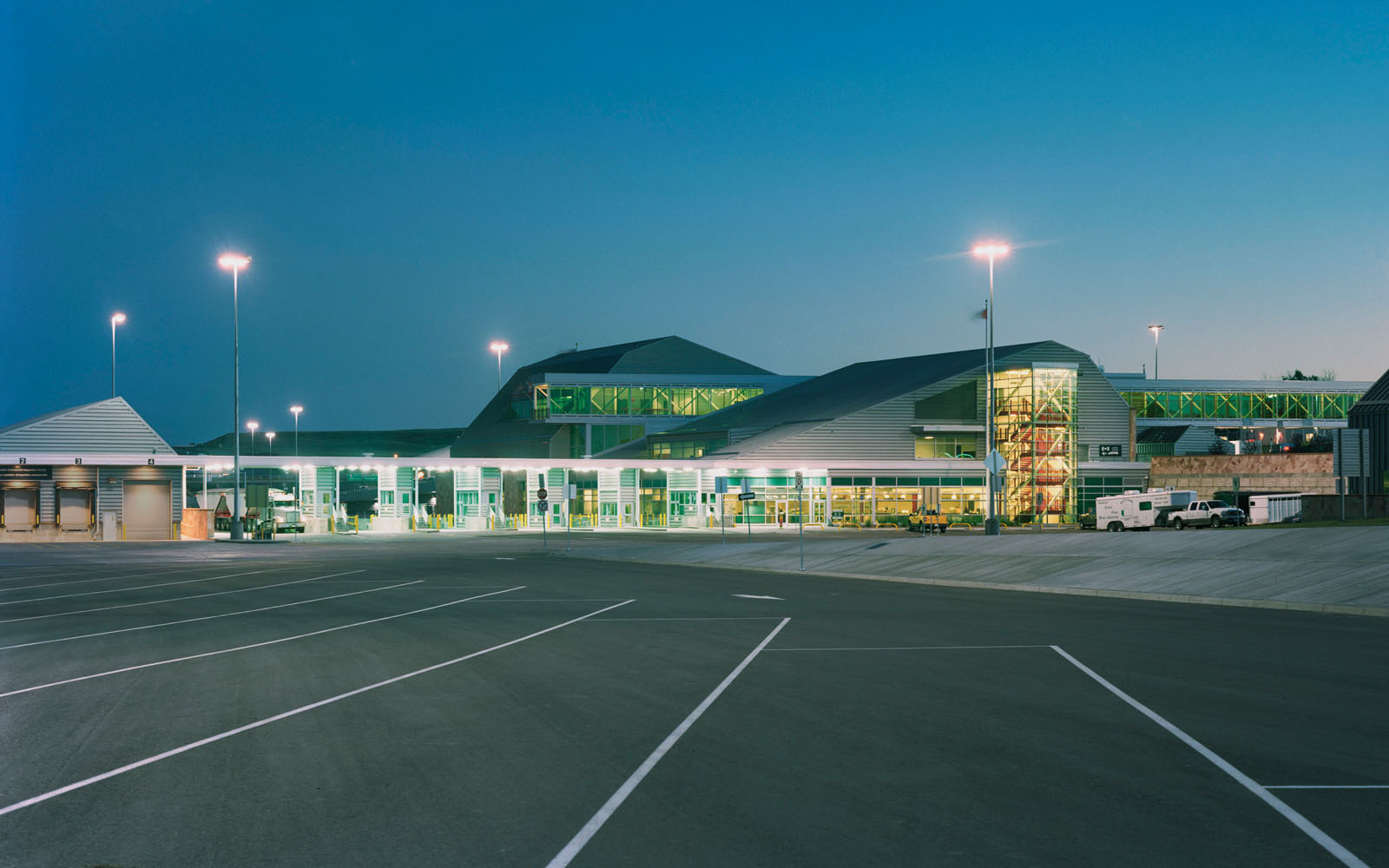The Coutts-Sweetgrass Border crossing linking Alberta and Montana includes a three-storey, 6000 sqm main processing building and six ancillary buildings. This border processes both traveller and commercial vehicle traffic. The main building is an integrated US and Canadian border services facility that spans the border between the US and Canada. A glass-enclosed bridge divides the two halves of the building and serves as a main circulation spine and access point to the building from the adjacent communities of Sweetgrass and Coutts.