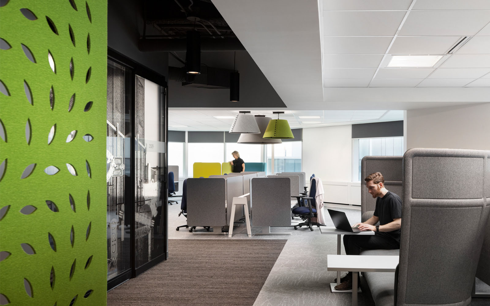 Inspired by the city’s urban landscape, the open office is filled with natural light and anchored by a vibrant lobby featuring a backlit mural of the downtown skyline and River Valley Bridge. At its heart, a central core reflects the energy of downtown Edmonton and connects to themed ‘neighbourhood’ collaboration zones – each with its own identity inspired by iconic local destinations like Whyte Avenue and William Hawrelak Park.