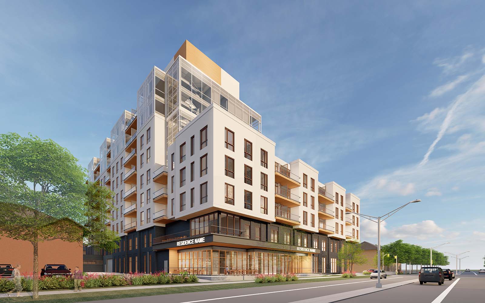 Proposed as a 160-unit seniors living residence, the project forms part of the revitalization of an underutilized site, providing convenient access to nearby amenities and enhancing neighbourhood walkability.