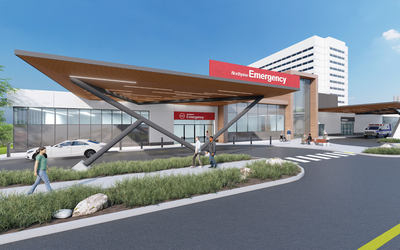 The current approved scope includes new construction, as well as renovation of existing space for a combined total of 58,200 SF. This will enable the ED to expand from its current 34 treatment spaces to 56; also included is relocation and growth of two adjacent clinics- Fracture and Cardiac Diagnostics. New construction comprises a one-storey expansion, a new mechanical penthouse, exit corridor and exit stair, and two new canopied driveways dedicated to walk-in patients and ambulance arrivals respectively. Site and landscape development includes reconfiguration of a portion of the main hospital ring road and adjacent parking lot areas to allow for the building expansion and to create pedestrian paths and vehicular roadways that meet current safety and accessibility standards.