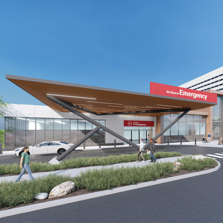 Kasian re-evaluated the sloped and heavily serviced site and explored alternative approaches that would ensure uninterrupted hospital operations while facilitating efficient, phased construction. Our design team developed and presented a revised Master Plan that strategically positioned a new, standalone—yet connected—facility adjacent to the existing hospital. This innovative solution introduced an internal courtyard, which maintained fire egress pathways, preserved access to natural light for both the existing and future facilities, and enabled the construction of the expansion without disrupting critical hospital functions. The new design also reduced the building’s footprint by reconfiguring the program across four levels instead of three, thereby creating more space on site for parking and landscaping.