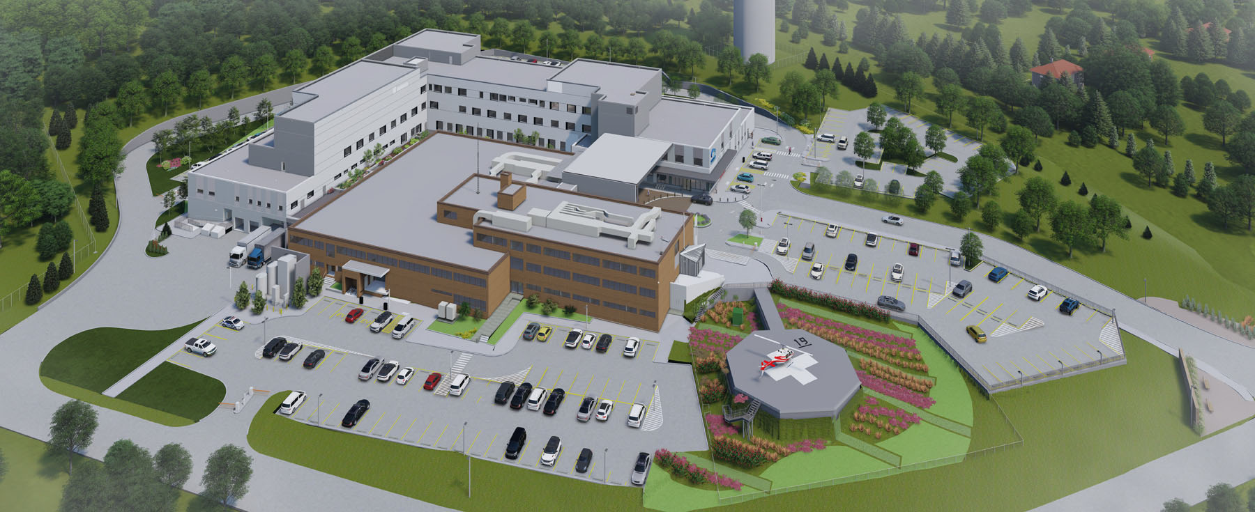 The new building will house all of the hospital’s acute care programs, including an Emergency Department with four ambulance bays; a Surgery Unit with three operating rooms; a Birthing Unit with five Labor, Delivery, Recovery, and Postpartum (LDRP) and a dedicated C-section OR; and Inpatient Beds covering Medical/Surgical, ICU, Mental Health, and Palliative Care. These clinical programs will be supported by essential support services such as a Laboratory, Pharmacy, Medical Device Reprocessing (MDR), and Materials Management—including new clean and soiled loading docks. The site planning scope also includes provisions for an elevated helipad, currently under construction as part of the Early Works.