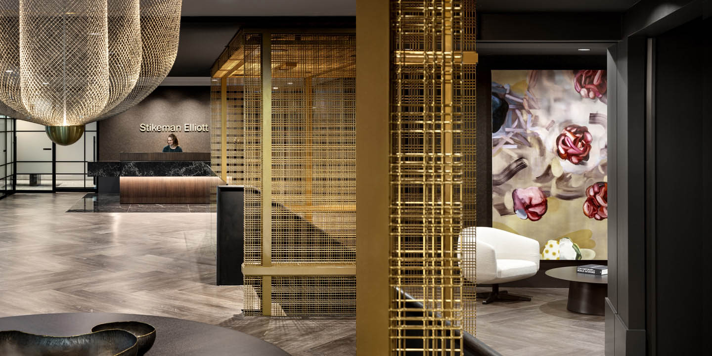 A new U-shaped internal staircase with gold-gilded canopy connects the two floors. The powder coated golden metalwork encases the stair opening and extends downward as a curtain wall. The bankers wire with its gridded pattern makes for a striking structural element that also meets fire code requirements. A functional handrail eases movement between levels. Suspended from the canopy and adding detail to the ceiling is a custom brass sculptural light fixture. Integrated technological capabilities such as virtual courtrooms reflects the evolving nature of legal practice.