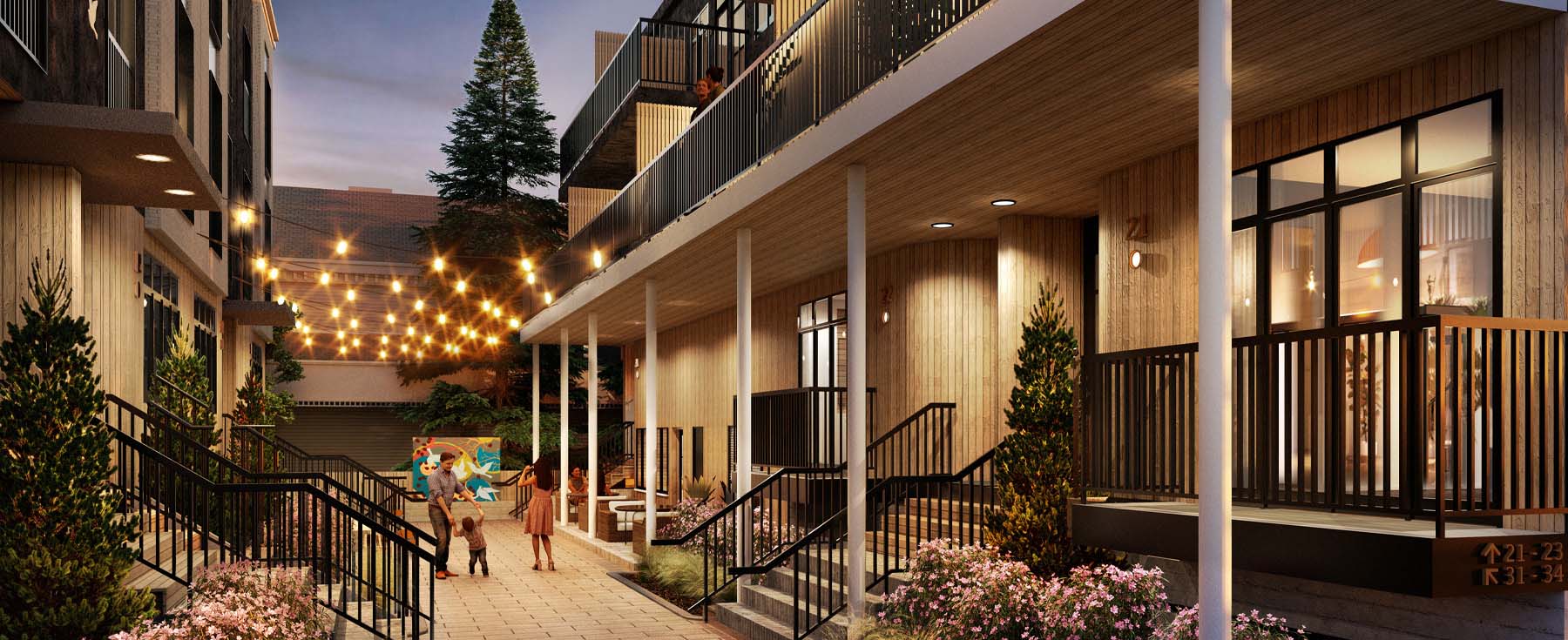 The development prioritizes livability and accessibility, fostering connections between residents. Stacked living units offer a range of dwelling sizes, including 3-bedroom units that cater to families and multi-generational living, as well as 1-bedroom ground floor and basement suites. Every unit is naturally daylit from either end. Walk-outs and balconies ensure living and bedroom spaces have ample access to the outdoors. Access to units is provided from both the street and the lane, further encouraging interaction and fostering a sense of togetherness.